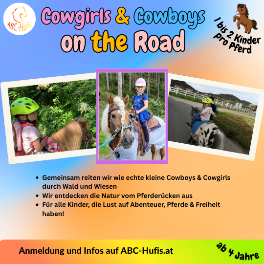 Bei unserem Cowboy- & Cowgirl-Programm entdecken Kinder die Natur auf eine ganz besondere Art – vom Pferderücken aus. Gemeinsam reiten wir durch Wald und Wiesen, lauschen dem Wind, folgen geheimen Pfaden und spüren die Freiheit, wie es nur echte kleine Reiter:innen können.